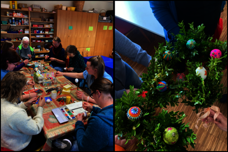 Nach einer erholsamen ersten Nacht im Gästehaus St. Dominikus erwartete uns bei bestem Wetter ein wunderbares Programm: Morgenlob, eine Führung durch die Barockkirche und das Kloster, ein geführter Besuch durch die Hummelausstellen und den wunderschönen Franziskusgarten. Dazwischen blieb sogar noch Zeit für ein Stück himmlischen Kuchen im Klostercafé. Damit wir für den Gottesdienst am Palmsonntag vorbereitet waren, bastelten wir auch noch kleine Palmen mit selbstgemalten Eiern. Nach dem Palmsonntag-Gottesdienst und dem Mittagessen mussten wir schon wieder Abschied nehmen. Das nicht nur vom Kloster Sießen sondern auch voneinander. Denn aus dem „Zeit für mich“- Wochenende wurde ganz schnell auch ein „Zeit für uns“-Wochenende, bei dem wir als Gruppe rasch zueinander gefunden hatten und gemeinsam gelacht, gesungen, gebetete und uns gegenseitig gestärkt haben.