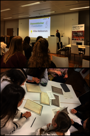 Anfang April waren wir, die Lateinschülerinnen aus den neunten Klassen, zu Besuch im Stadtarchiv der Stadt Stuttgart. Im ersten Teil der Exkursion erhielten wir eine Führung durch die unterschiedlichen Bereiche des Stadtarchivs mit einer Vorstellung der verschiedenen Arten an Quellen wie Gemälde, Sammlungen von Zeitungsartikeln, historische Schriftstücke, … Besonders spannend hierbei war, dass uns beispielsweise ein Zeitungsartikel und eine Rede von der Einweihung von einem Teilgebäude des St. Agnes von 1971 gezeigt wurden.