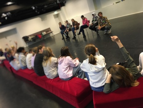 Das JES ist vom St. Agnes nicht weit entfernt, weshalb wir hinlaufen konnten. Dort wurden wir im Foyer von Frederic, dem Theaterpädagogen und Beilul, einer Praktikantin, abgeholt. Unser Workshop fand in einem Raum mit vielen roten Polstern statt, auf die wir uns erst einmal gesetzt und einander vorgestellt haben.