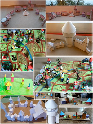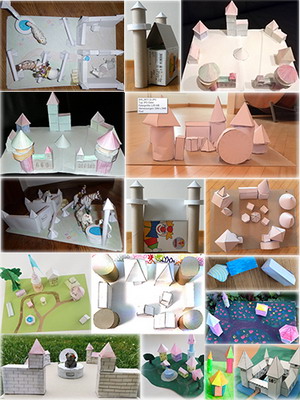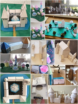 Die Klasse 5b präsentiert ihre gebastelten Werke aus geometrischen Figuren aus ihrer Home-Schooling Zeit vor Ostern. Sie hatten die Aufgabe "Fantasiedörfer, Burgen oder Schlösser mit geometrischen Figuren zu erstellen", damit sie geometrische Körper kennenlernen und ihre Eigenschaften mit ihren Händen und Augen erfassen konnten.
